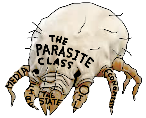 The parasite class controls the state and its various branches (such as its armed forces) and uses these for its own purposes (mainly to influence policy to increase its members’ wealth and power). It’s main tools of wealth generation are the financial sector (FIRE) and the fossil fuels industry (“oil” in the picture). To stay in power it does not just rely on the state and (its means of) coercive power, but mostly on its two propaganda branches: mainstream (neo-classical) economics and the mass media.